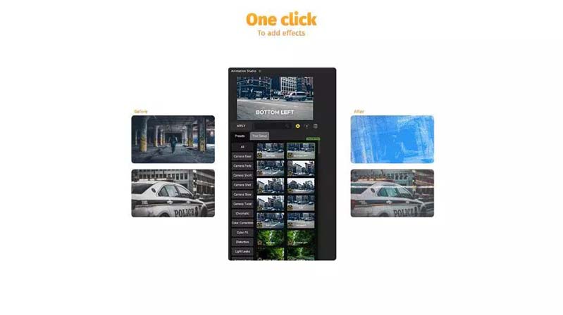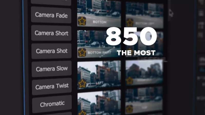 超过850个职业效果。这是一个包含850个效果和预设的库,它将为您节省大量时间,并帮助您在几分钟内专业地编辑您的视频。蒙太奇库包含17种不同类别的所有即用型效果:相机移动,色彩效果,色彩效果,失真,漏光,屏幕节拍,速度节拍,时间效果,转场,色彩校正,屏幕效果。每个类别包含不同类型的效果,并创造独特的时尚外观。单击一下即可应用预设,并使用控制面板根据需要进行调整。我们会经常更新蒙太奇图书馆并添加更多类别和效果。