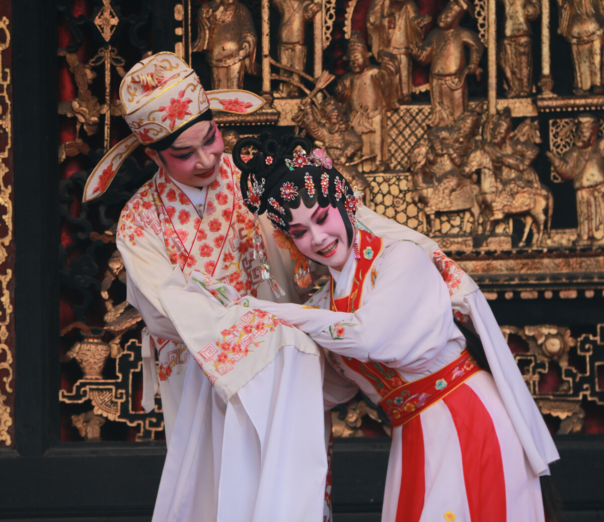粤剧,中国汉族地方戏曲,又称“广府大戏”,“广东梆黄”、“广东梆子”、“广东大戏”,是广东省地方代表戏曲之一。发源于佛山,其源流可溯道明嘉靖年间。旧时,佛山的粤剧戏班有一个惯例:每年六、七月份,在外演出的各个戏班都会返回佛山,解散旧班底,重组新班。而新班的首场戏定要在祖庙万福台上演,审阅通过之后,新班才可以乘着红船下到广东四乡演出。由于广府人的先祖来自不同地域,所以粤剧的发展也受到戈阳腔、昆腔、汉剧、微剧、秦腔等多个剧种的滋润与影响,取各家之长,自成风格:既与传统的戏曲文化一脉相承,又具有浓郁的岭南文化特色。